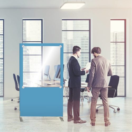 Le panneau vertical VEO-Protect de SILENCIO est équipé d’une large surface transparente qui permet de garder un lien social au sein des équipes.
