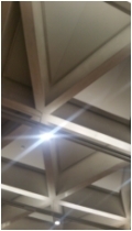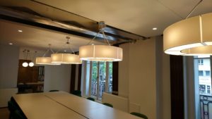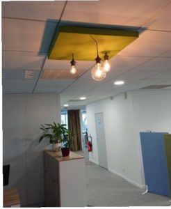 Fabrication et pose par notre partenaire de panneaux acoustiques 1200×1200 dans un restaurant. Ceux-ci sont alignés sur le décaissement du plafond. Le phénomène d’echo est réduit